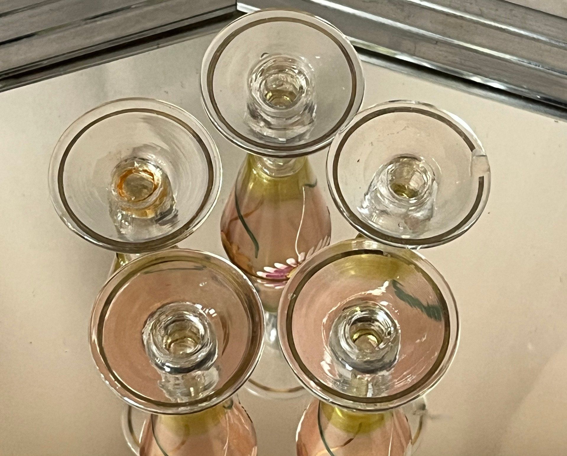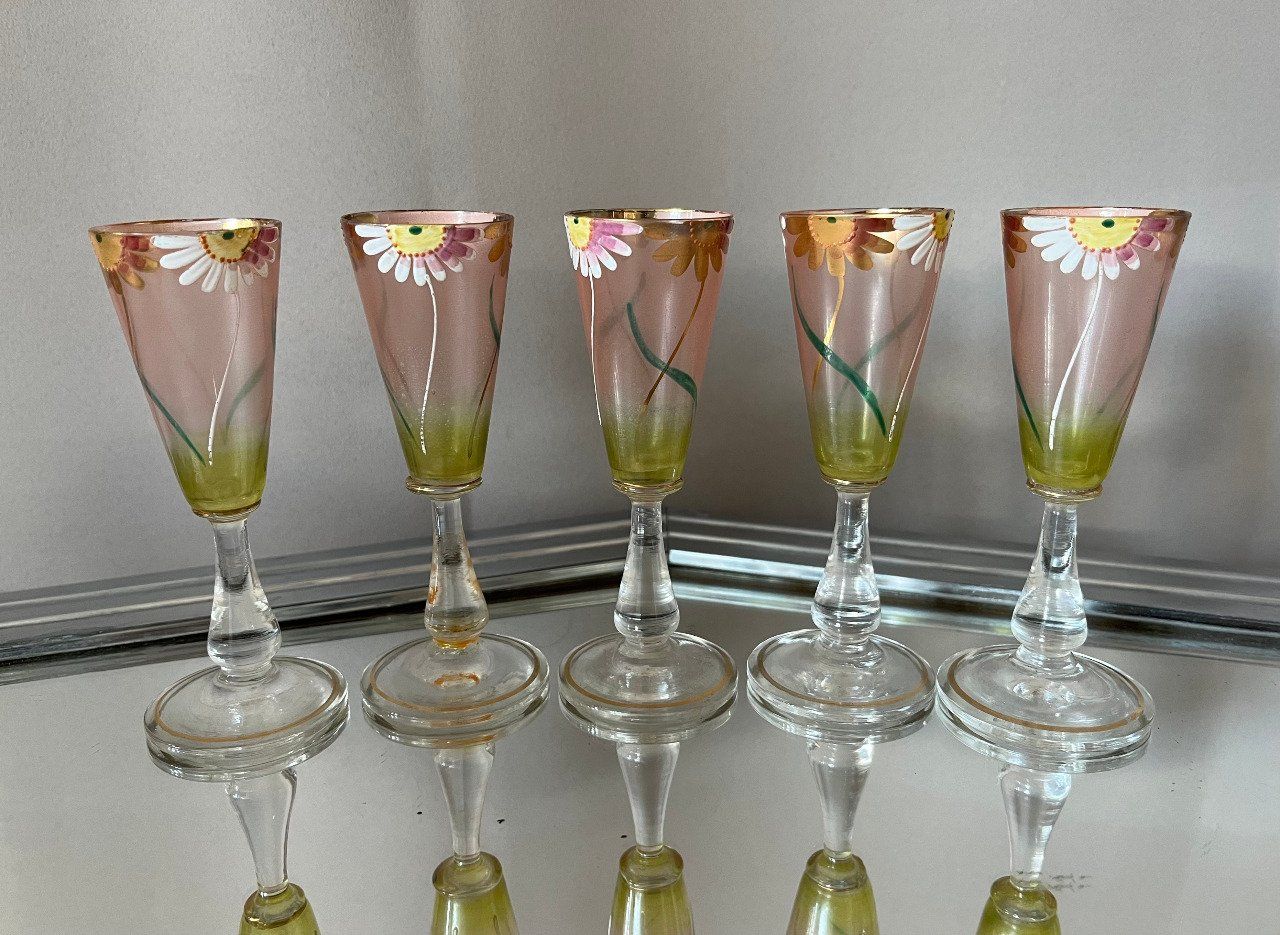 Rare ! Superbe ensemble de 5 verres à liqueur, verre fumé rose et vert, émaillé - Style Art nouveau