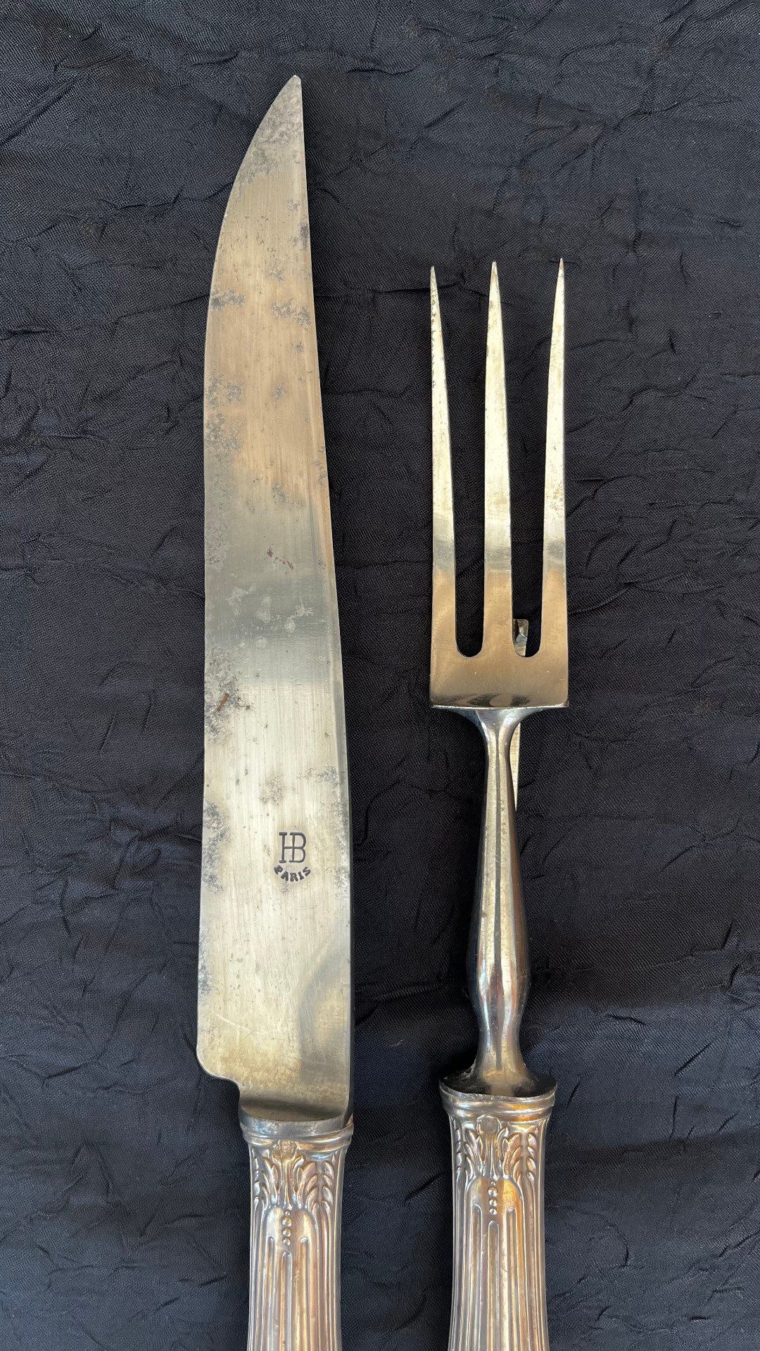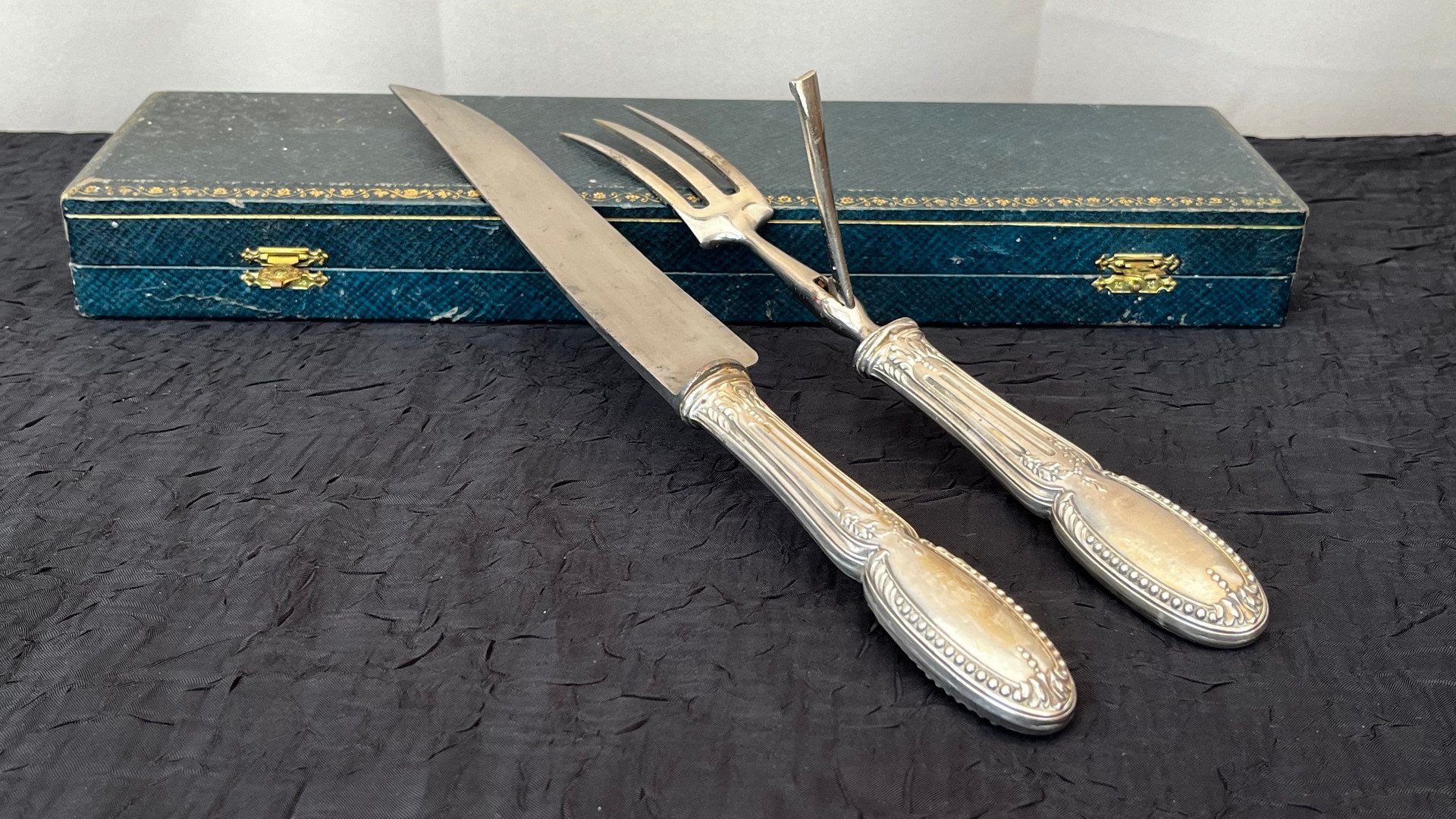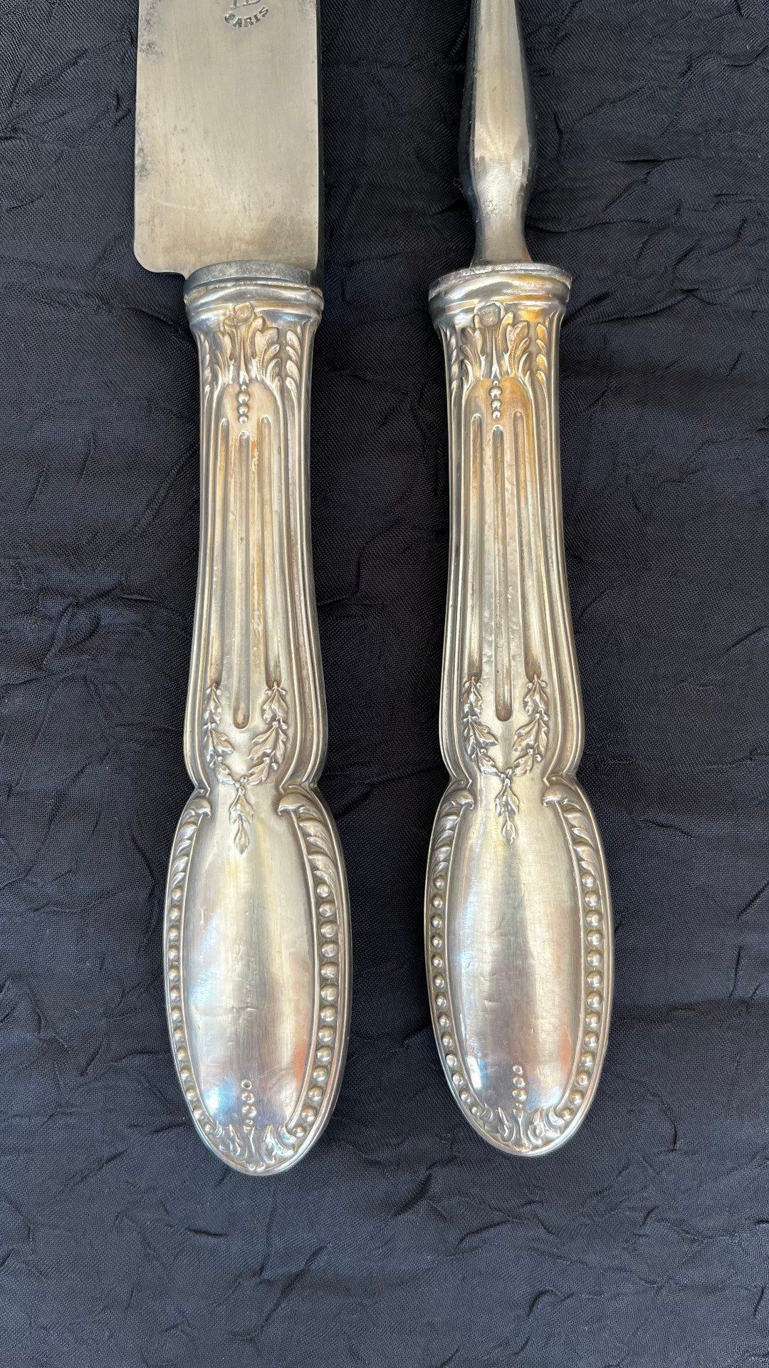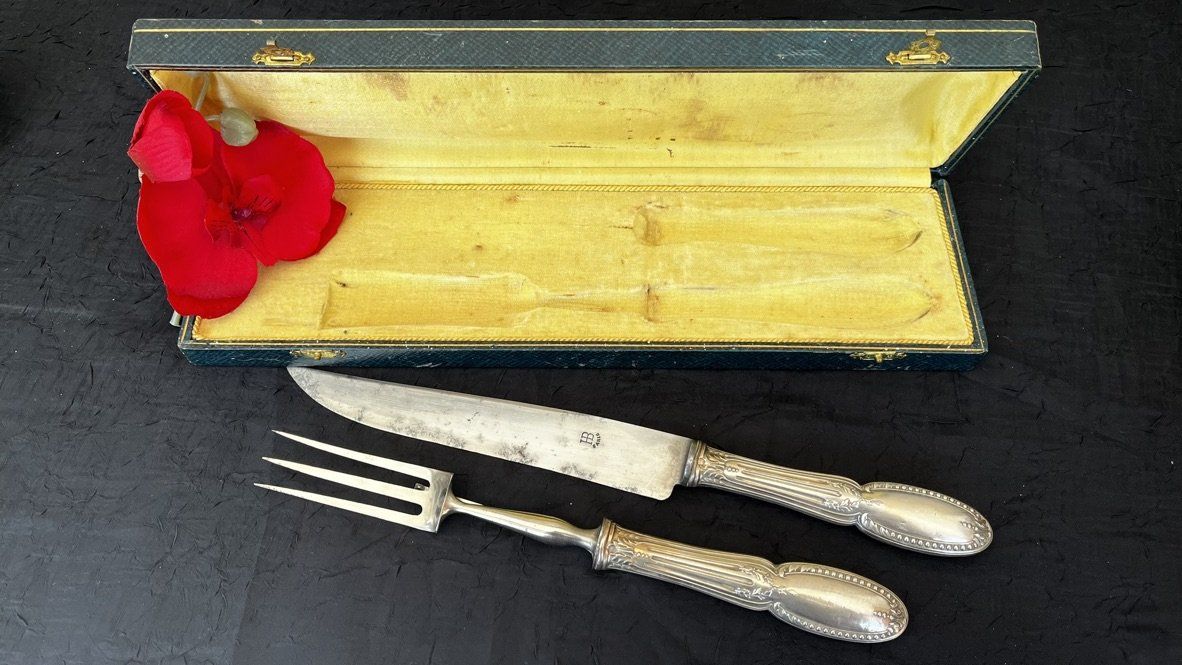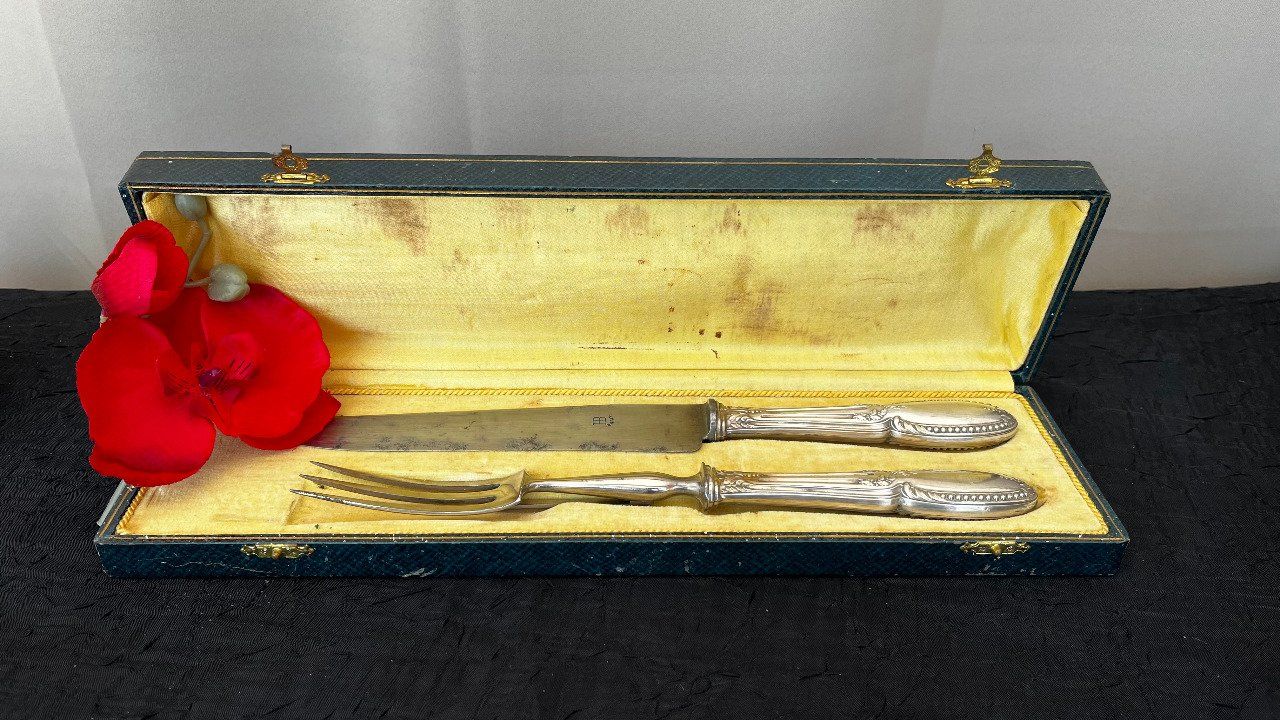 Élégant service à découper composé d'un couteau et d'une fourchette à gigot. Manches raffinés ornés d'une délicate frise de perles et de feuillages stylisés. Lame signée HB Paris. Couverts présentés dans leur écrin d'époque. Voir description détaillée.