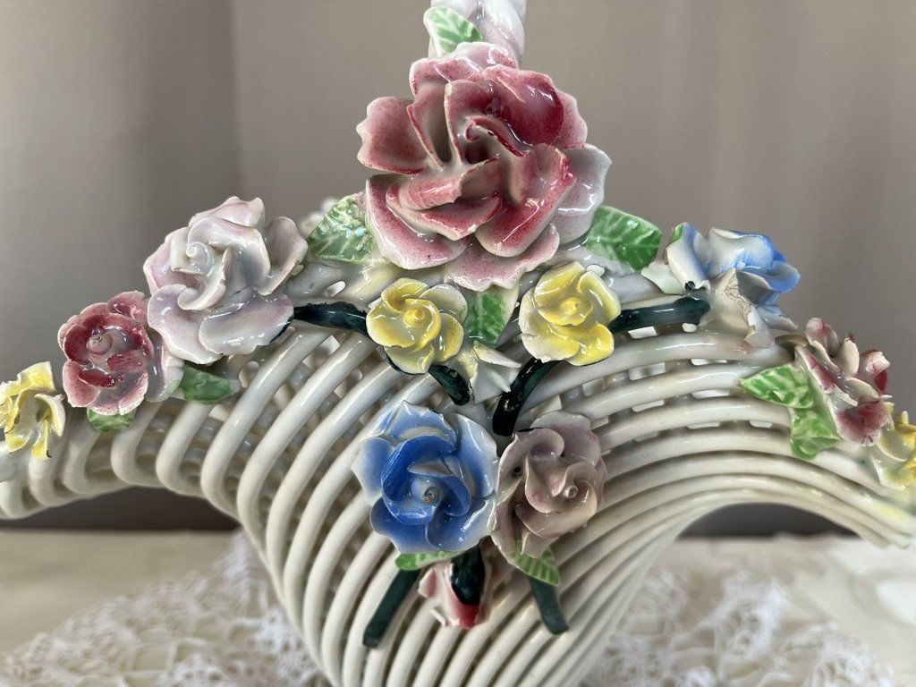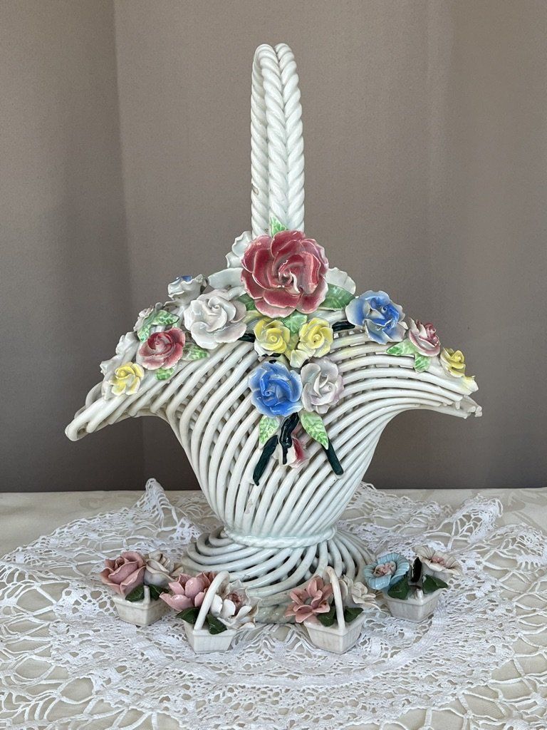 Cet ensemble exceptionnel apportera une touche de raffinement et de romantisme à votre décoration intérieure. Il se compose d'un grand panier en céramique (faïence ou porcelaine tendre) imitant la vannerie tressée, caractéristique des productions artisanales italiennes de Bassano ou Capodimonte. La anse est tressée et la bordure de la corbeille est généreusement ornée de fleurs en relief modelées à la main : de belles roses aux couleurs variées. L'intérieur du panier révèle un charmant bouquet de fleurs délicatement peint au centre du fond. Sous la base, on distingue un marquage artisanal "N2".
