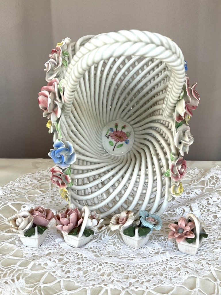 Superbe panier floral tressé style Capodimonte et 4 miniatures bouquets de fleurs
