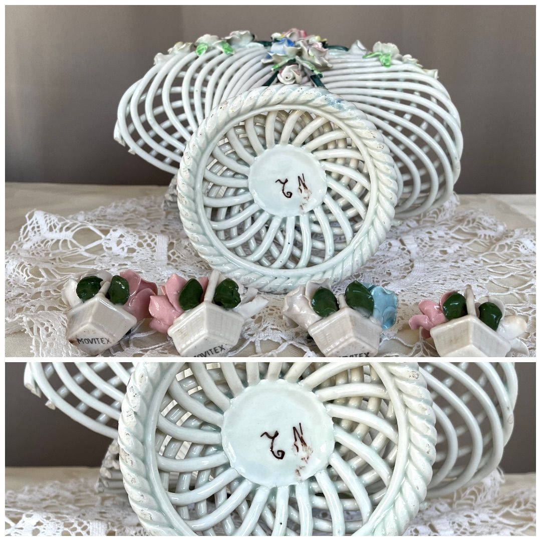 Magnifique ensemble vintage comprenant une corbeille tressée en céramique style Capodimonte ou Bassano, orné de fleurs colorées en relief. Avec 4 bouquets miniatures, barbotines en signées Movitex. Quelques défauts d'usage sur le panier. Voir description.