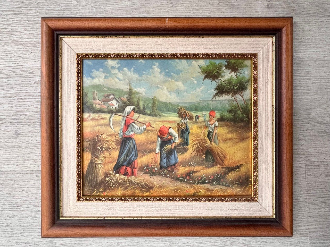 Tableau en Émaux d'Art "La Moisson" - Scène Rurale Ancienne, cadre en bois