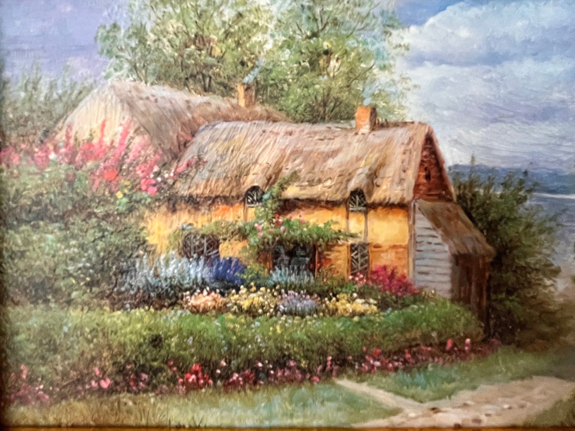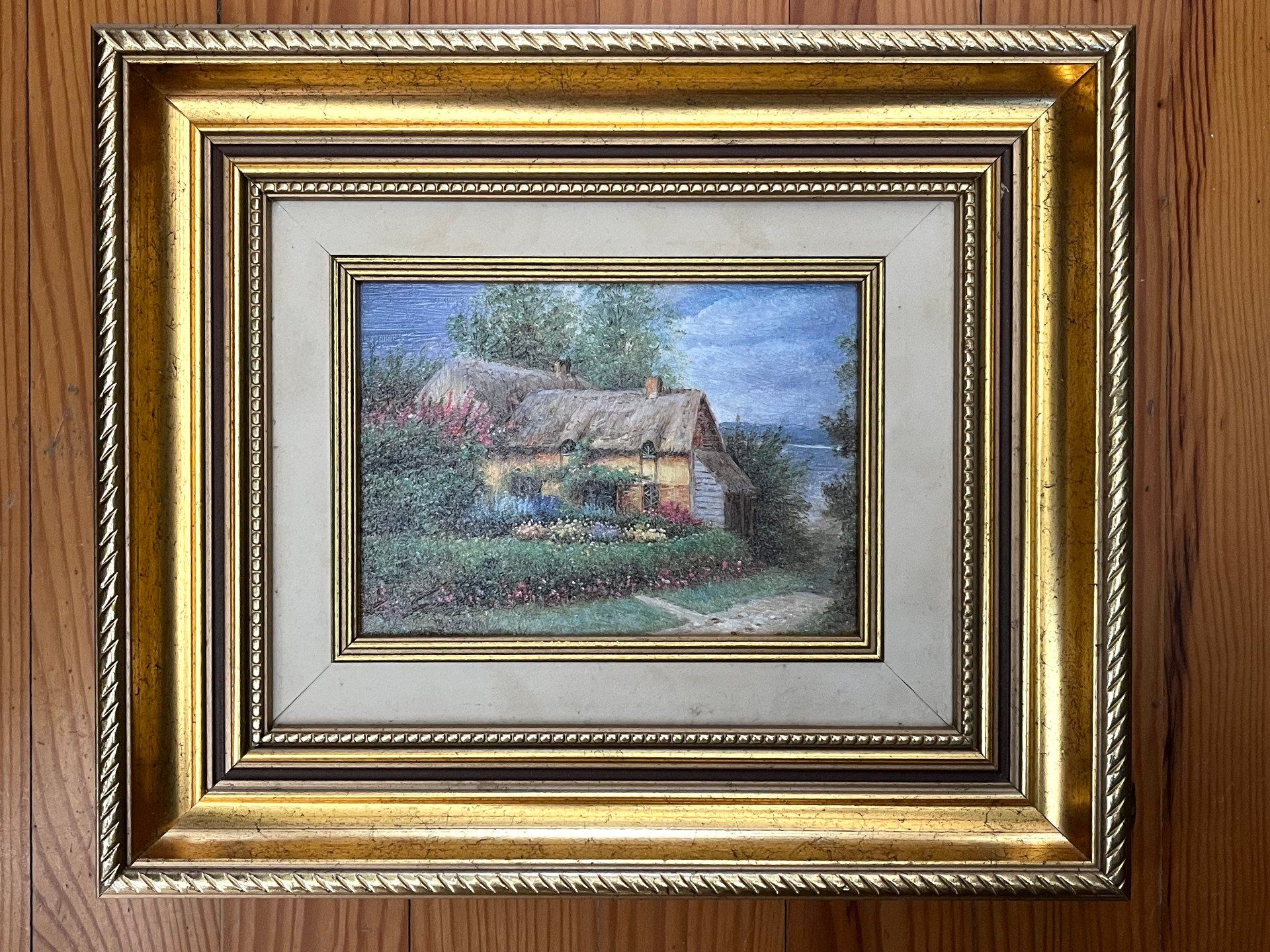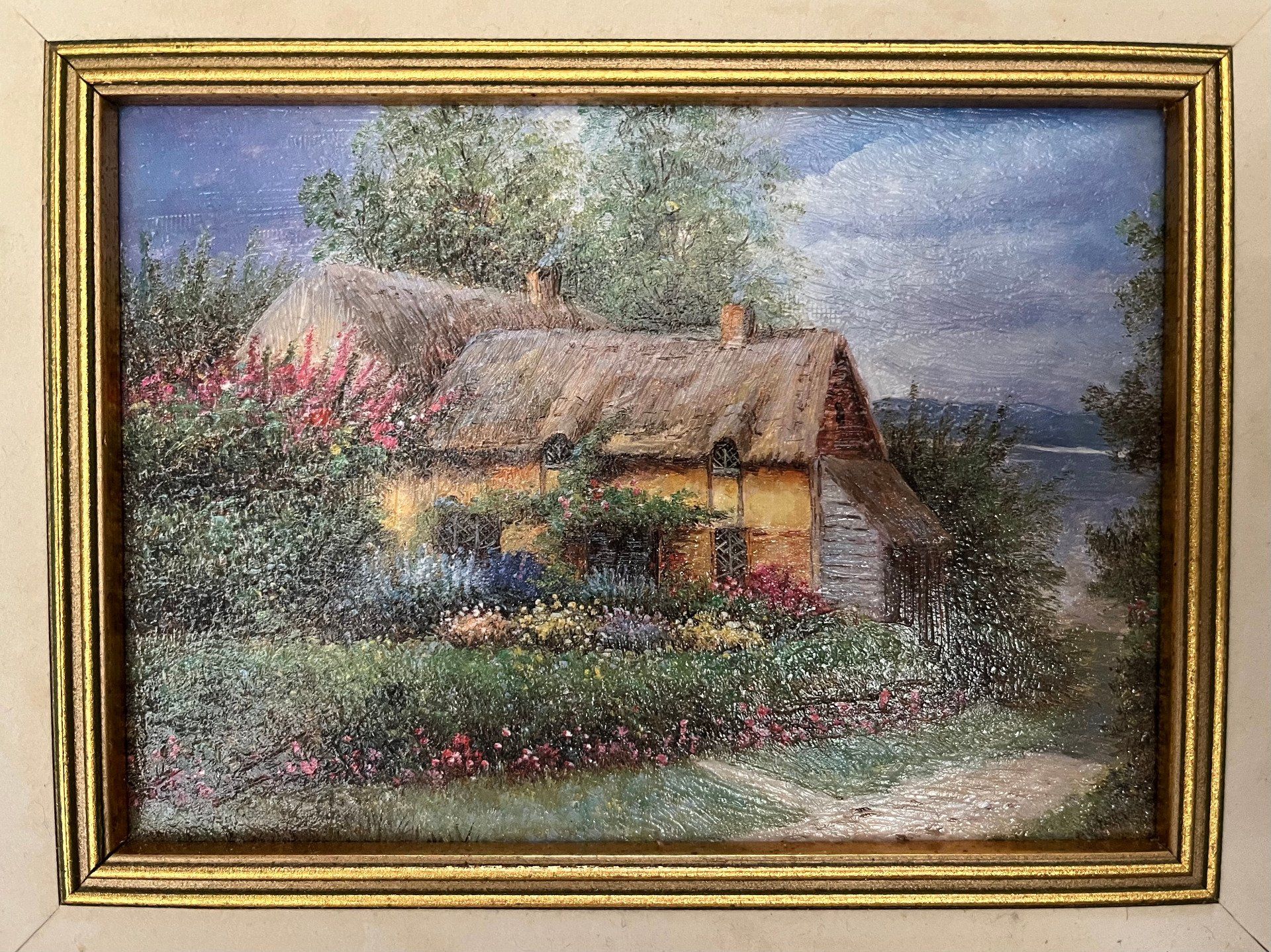 Charmant tableau maison de campagne au toit de chaume, cottage entouré de fleurs, toile dans un cadre en bois doré. Ambiance douce et bucolique, idéale déco campagne chic. Voir description.