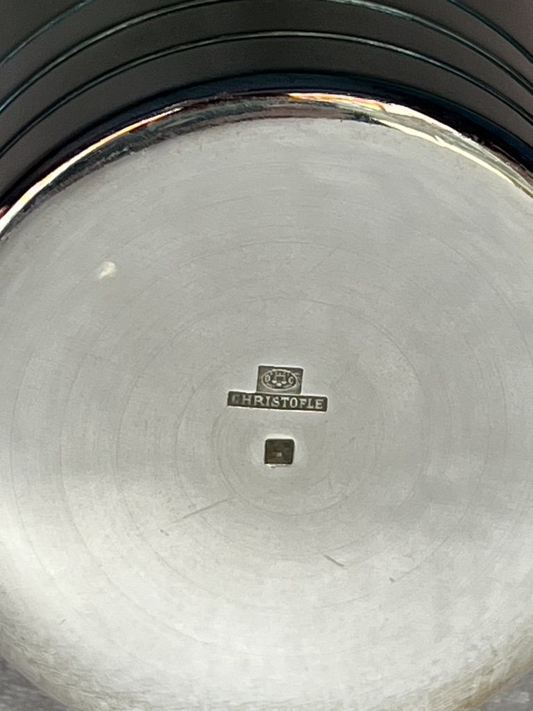 Sous le gobelet, l'authenticité est garantie par trois poinçons : l'inscription "CHRISTOFLE", la balance entourée des lettres O et C, ainsi que le cavalier d'échecs entouré des mêmes initiales.