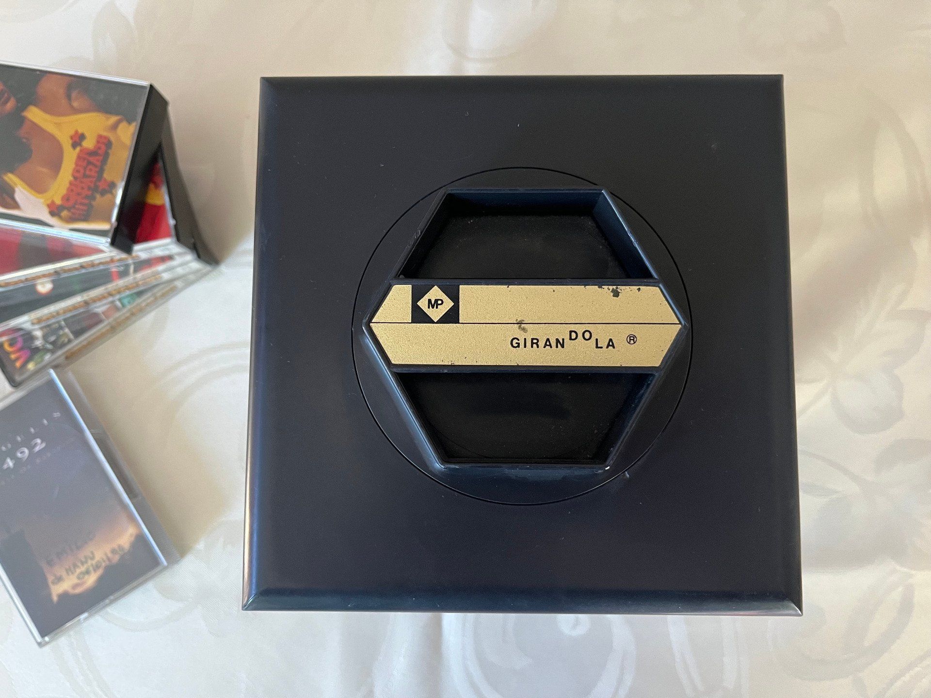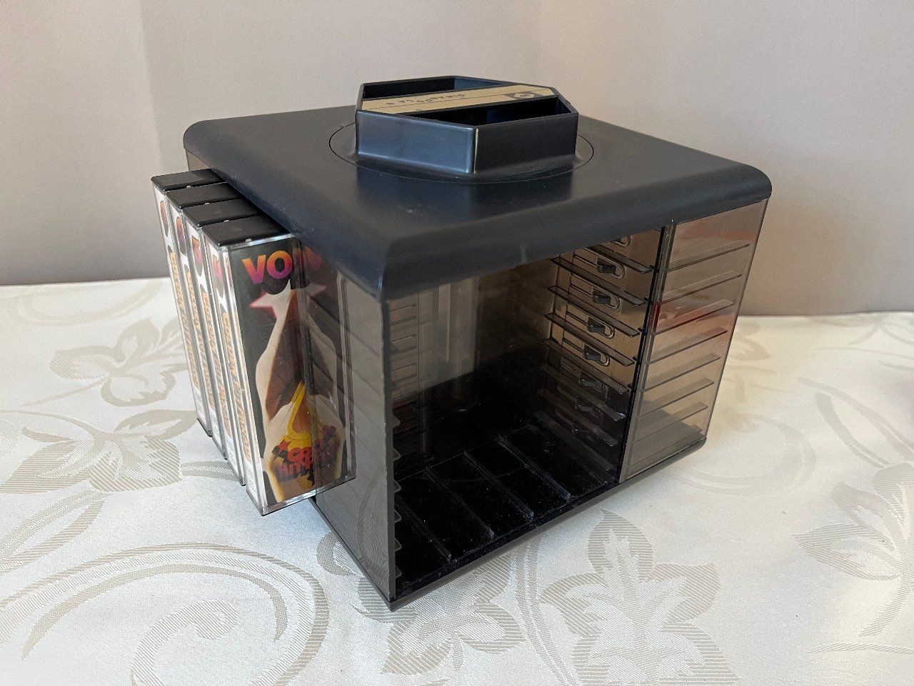 Pour ranger et retrouver en un coup d’œil votre artiste préféré. Ce range cassettes audio de la marque Girandola en plastique noir et fumé des années 70 est pivotant et en très bon état. Pour 20 k7 (5 cassettes par coté). Dimensions 16 X 16 cm H 14,50 cm