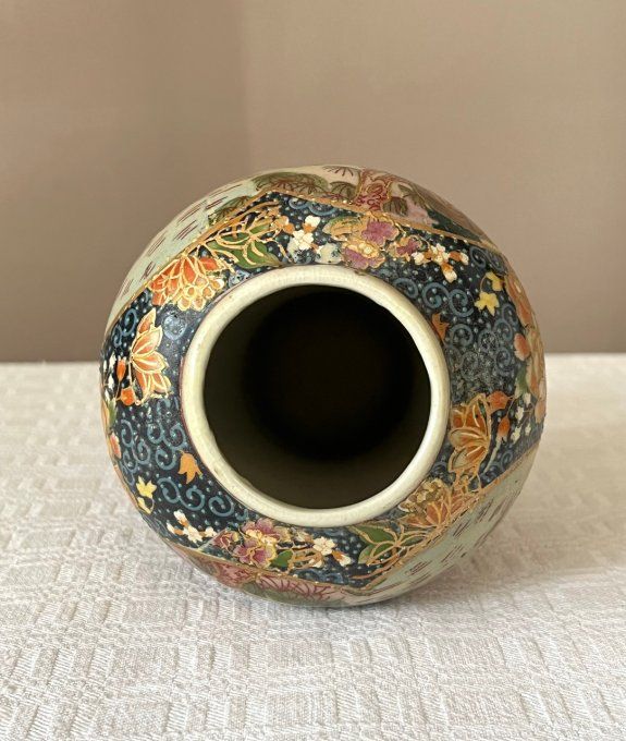 Vase en porcelaine venant de Chine, signé Zhong Guo Zhi Zao, style Satsuma, des années 80. Entièrement peint à la main, à décor japonisant de geishas, de Dannas (hommes), arabesques et ravissantes fleurs, dorures en relief. Voir description.