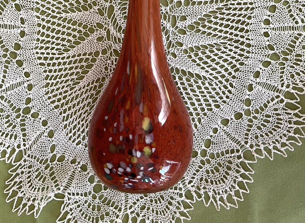 Très beau soliflore en verre soufflé marbré orange / marron, élancé en toute élégance ! Vase tachetés avec inclusions multi couleur à sa base, dans le gout de Murano ou La Rochère, pas de signature. En très bel état. Hauteur 29 cm. Voir descriptif